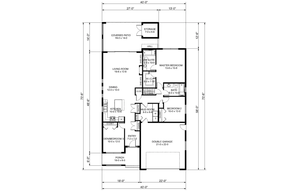 This three bedroom modern bungalow house plan features an open living area, a master suite with ensuite bathroom and walk-in-closet, and a covered patio with an outdoor kitchen area.